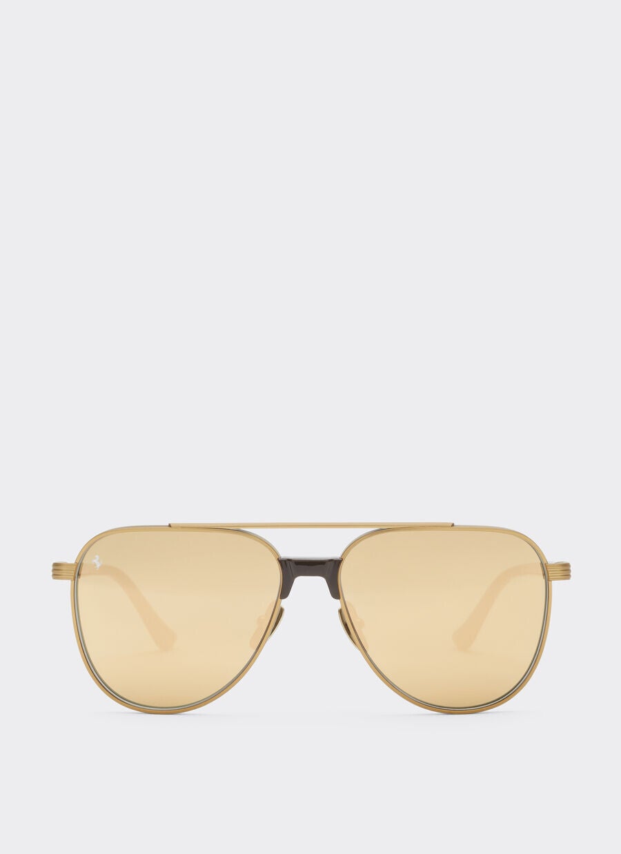 Ferrari-Sonnenbrille aus Titan mit zeitgemäßer Pilotenbrillen-Silhouette, Ausdruck einer perfekten Balance zwischen Form und Funktionalität. Der Titanrahmen mit Doppelsteg erinnert an den ikonischen Stil des Modells, während die lasergravierten Nasenpads und die fein gearbeiteten Linien eine überragende Liebe zum Detail offenbaren. Die Acetatbügel, verziert mit Metallstiften und dem Ferrari-Logo, verleihen der Brille einen Hauch von Luxus und Raffinesse. Abgerundet wird das Accessoire durch das innovative BT Flex Ferrari-Scharnier aus Titan, das für maximale Flexibilität, Leichtigkeit und eine perfekte Passform sorgt und ganz im Zeichen der Exzellenz von Ferrari steht.